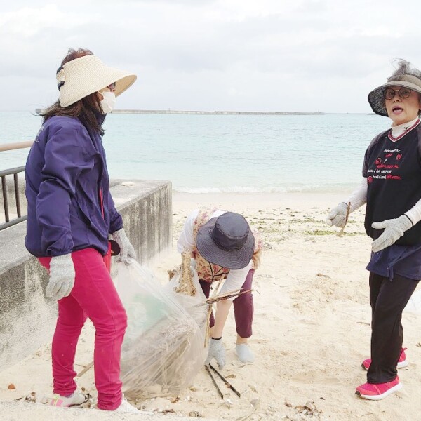 宮古島商工会議所女性会(前里博美会長)の会員が19日午前、平良下里のパイナガマビーチでクリーン活動を行い、砂浜に散乱したゴミや打ち上げられた海草などを拾い集める作業に汗を流した。