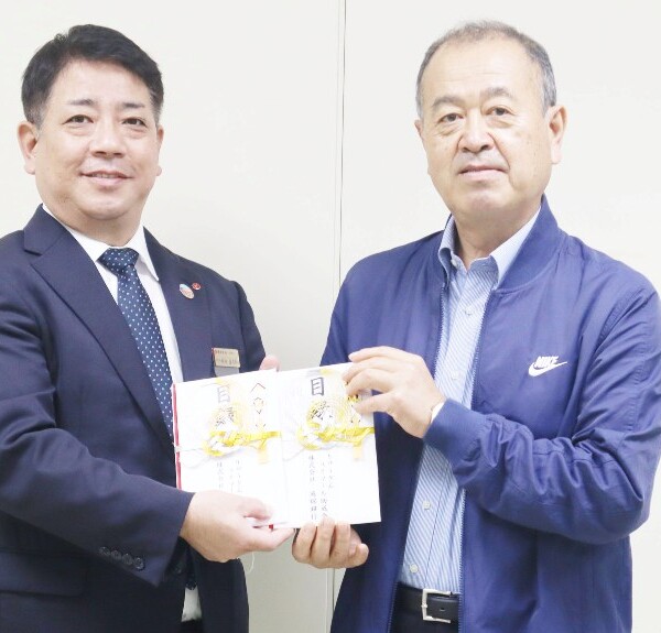 琉球銀行(川上康頭取)は15日、児童養護施設の漲水学園(砂川繁信園長)に寄付金を贈呈した。今年度で卒園する2人の生徒の進学を支援するもので、新垣盛志郎宮古支店長が砂川園長に手渡した。