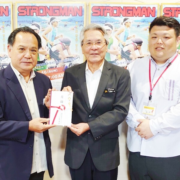 サンエー(宜野湾市、新城健太郎社長)は14日、第37回全日本トライアスロン宮古島大会で宮古島トライアスロン実行委員会(会長・座喜味一幸市長)に協賛金100万円を寄付した。