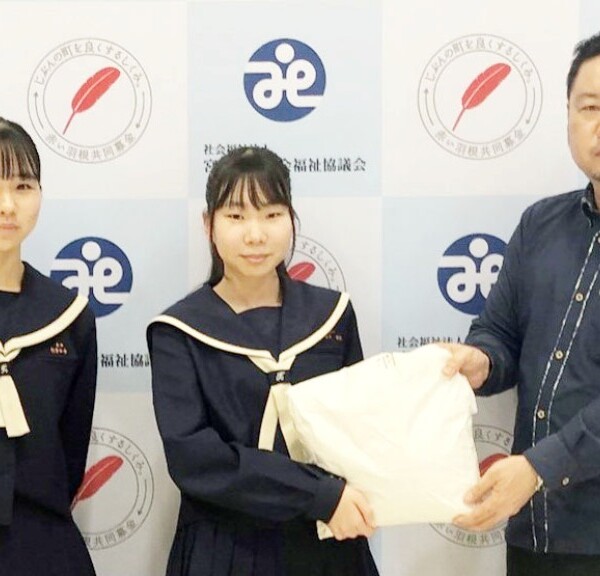 北中学校のエコ・ボランティア委員(菅原里花委員長)は9日、全校生徒378人を代表し、市社会福祉協議会に赤い羽根共同募金の寄付を行った。=写真=