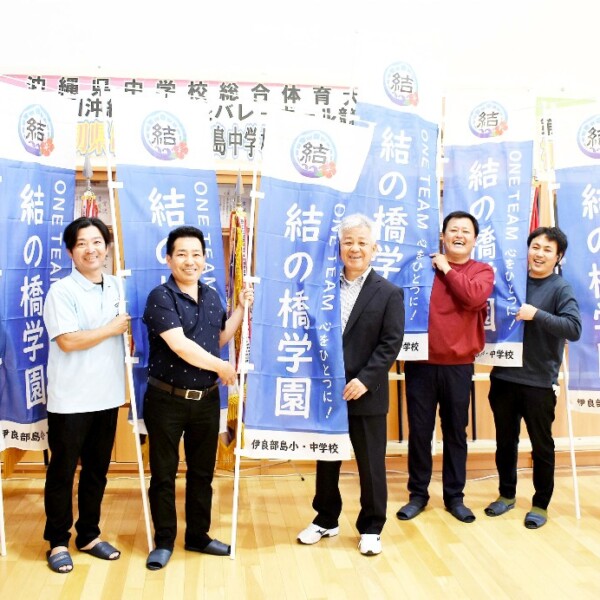 伊良部商工会青年部OB会(島袋正吉会長)は6日、伊良部島小中学校にのぼりを寄贈した。