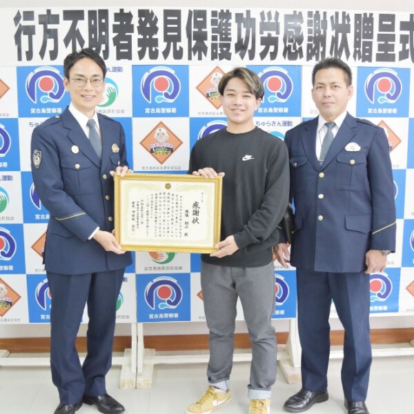 宮古島警察署(仲宗根宗信署長)は1日、行方不明になった女児の早期発見に協力したとして、帰省中の與儀翔斗さん(高知高校3年)に感謝状を贈った。
