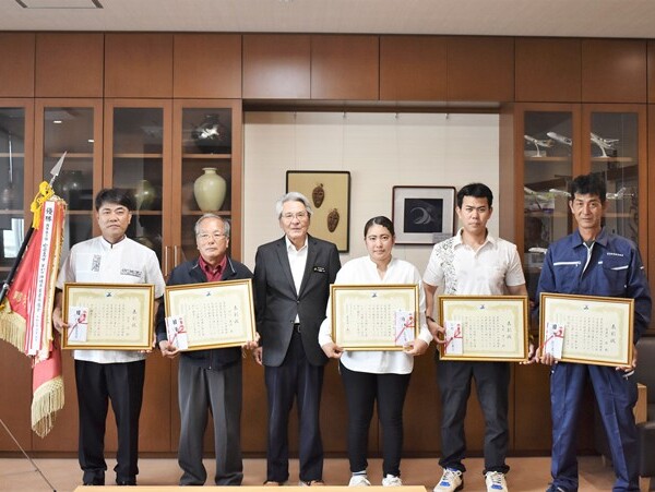 宮古島市(座喜味一幸市長)は30日、市役所で昨年11月に開催された第48回県畜産共進会肉用牛の部で2年連続団体賞に貢献した島尻博乃さん(平良下里)、島尻誠さん(平良西里)、喜屋武隆さん(平良東仲宗根)、砂川健治さん(下地嘉手苅)、上地美優桜さん(平良久貝)を市の産業に尽力し、顕著な功績があったとして表彰。改めて連覇の快挙をたたえた。