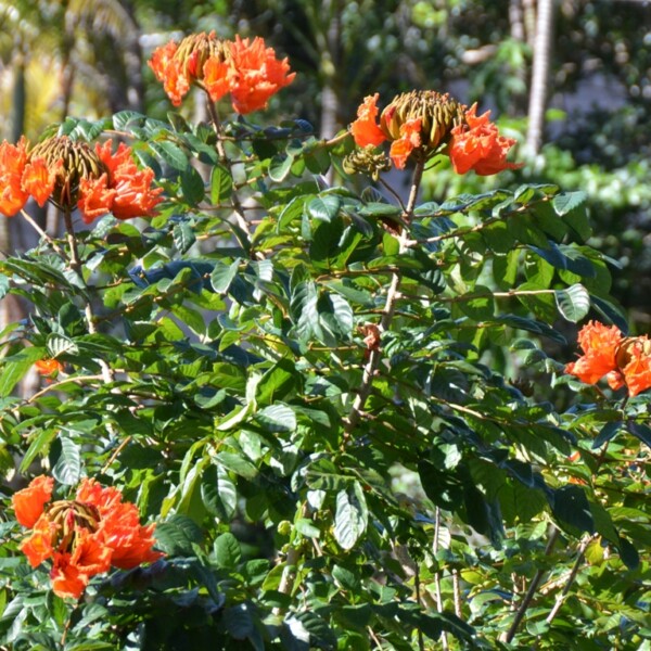 沖縄で例年4~7月に花を咲かせるカエンボク(ノウゼンカズラ科)が、平良東仲宗根の市総合体育館敷地内でひと足早くオレンジ色の燃えるような鮮やかな花を満開に咲かせている。