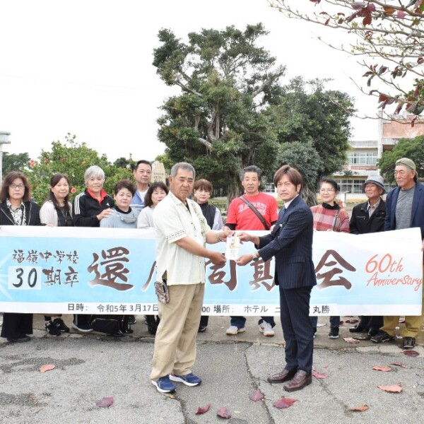福嶺小・中学校卒業生還暦記念同窓会(上原敏実行委員長)は18日、後輩の教育に役立ててほしいと福嶺小と城東中に金一封を寄付した。