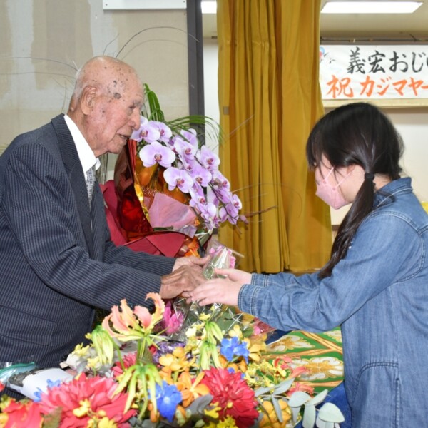伊良部長浜の佐久川義宏さんが10日、97歳の誕生日を迎え、伊良部長浜の長浜公民館で長寿を祝う「カジマヤー」が行われた。
