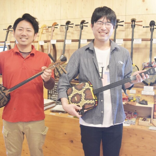 デンマーク発祥のおもちゃ「レゴブロック」を使って三線を作った小泉淳平さん(31)=東京都=が10日、「レゴ三線」を持参し、動画で三線の作り方を参考にしていた宮古木工芸(与儀昌樹代表)を訪れた。