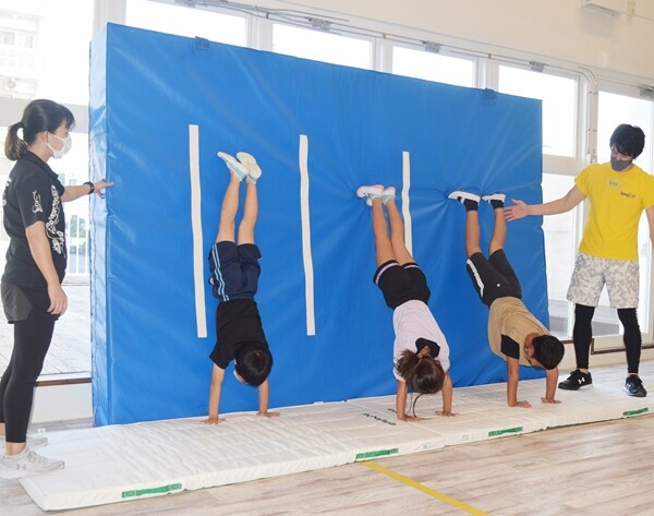 平良久貝のハチワレスポーツ(左近俊彦店長)は14、15の両日、小学生を対象にバック転教室を開催した。