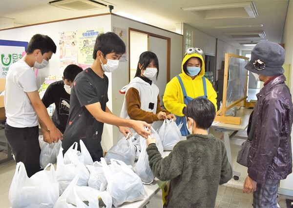 市社会福祉協議会と中学生ボランティアによるカボチャの無料配布会が15日、平良老人福祉センターで行われた。