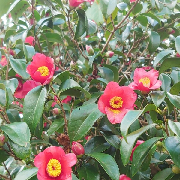 防風林や屋敷林、街路樹など広く植栽されているツバキ(=椿、同名科)が、1月に入って宮古各地で一斉に可憐で真っ赤な花を次々と咲かせ、落花して地面を染めるようになった。