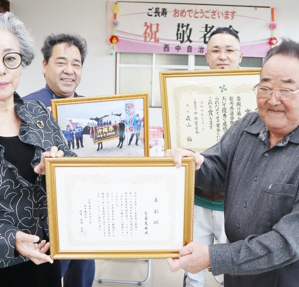西中自治会(宮國京子会長)は18日、宮國光雄さん(81)に畜産業における功績をたたえる表彰状を贈呈した。