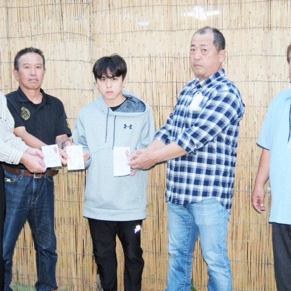 東学区体育協会 (仲宗根俊光会長) と保里二区自治会 (砂川清治会長)、 十三の会 (本村先也会長) は13日、 西仲宗根の十三の会事務所で、 北中学校の長田千寿さん (2年) に激励金を贈呈した。