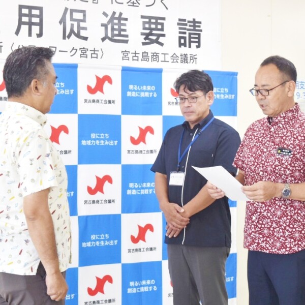 障害者雇用支援月間(9月1~30日)に合わせ、宮古島市と宮古公共職業安定所は3日、宮古島商工会議所を訪れ、根路銘康文会頭に要請した。