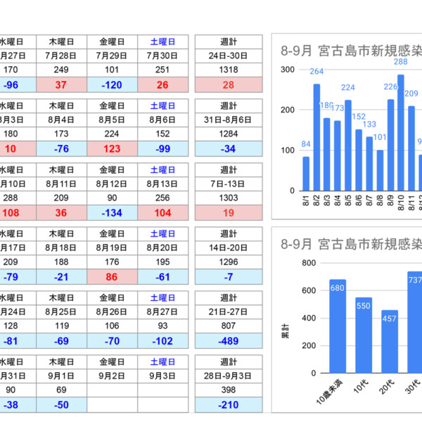 沖縄県は1日、宮古島市在住の新型コロナ感染者69人を確認したと発表。入院療養者は10人(中等症7人、軽症3人)。市での直近1週...