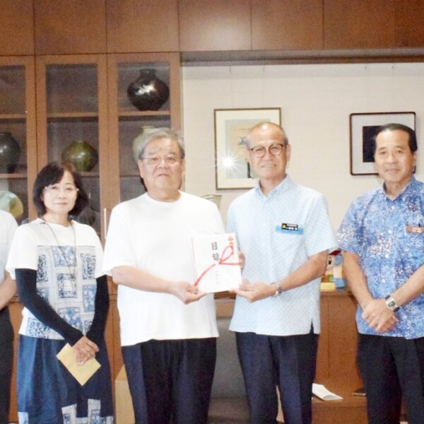 下地洲鎌で障がい者就労支援施設を運営する特定非営利活動法人ハートフルふきあげ(栃木県栃木市)の伊津井啓一会長らは20日、市役所に嘉数登市長を訪ね、寄付金の贈呈と今後の展望について語った。